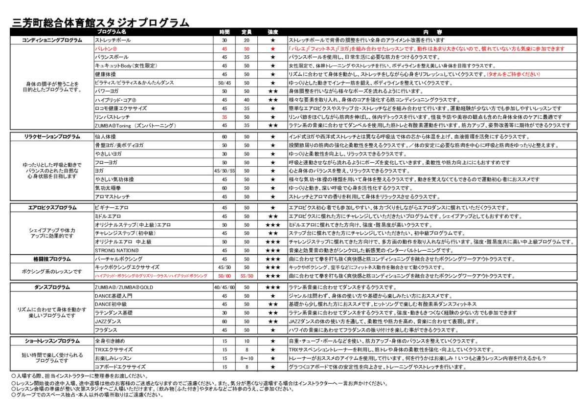 - ③レッスン開始後の途中入場、途中退場は他のお客様のご迷惑となりますのでご遠慮下さい。